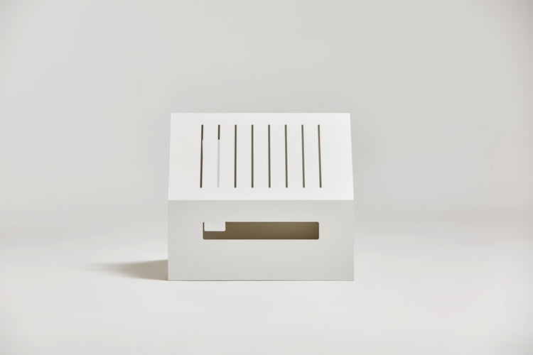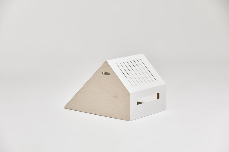 A minimalistic pet house with angular structures that embellish it. The elongated window allows for sunlight and ventilation, giving the pets a pleasant resting area.
